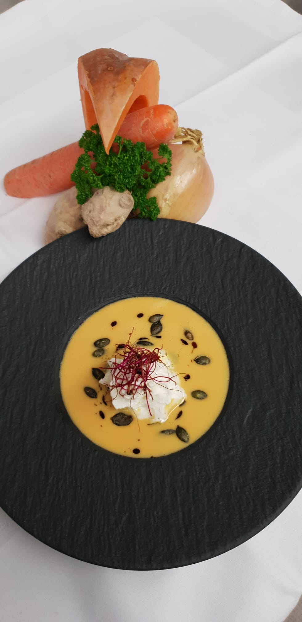 1.Kürbis, Karotten, Zwiebeln und Ingwer geschält in kleine Stücke schneiden und mit der geklärten Butter oder ein Pflanzenöl bei mittlerer Hitze anbraten. Mit Salz und Pfeffer würzen, danach mit Mehl bestäuben, umrühren und mit Gemüsebouillon auffüllen. Ca. 15 Minuten bei mittlerer Hitze köcheln lassen, pürieren, Rahm dazugeben und die kalten Butterwürfel untermontieren.