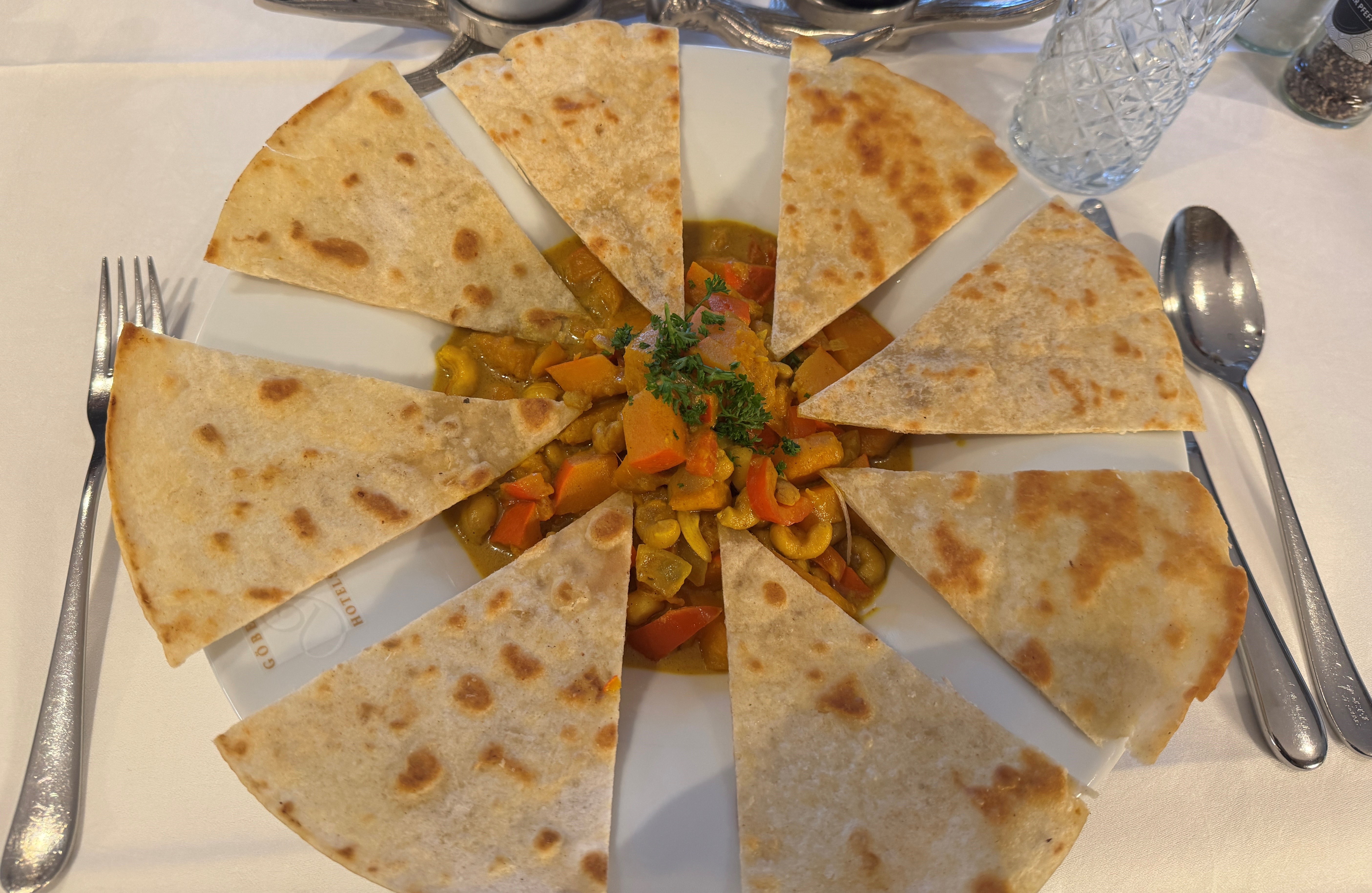 Mit Hokkaido Kürbis in Kokos-Currysauce mit Cashewnüssen und Paprika an Chapati. Ein Rezept aus dem Romantik® Hotel Stryckhaus in Willingen.