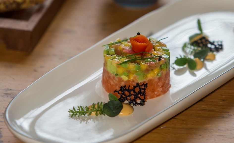 5.Im letzten Schritt richten Sie die Vorspeise an. Stülpen Sie dazu die Avocado-Mischung auf das Saiblingstatar und genießen Sie das Gericht gemeinsam mit der Misomayonnaise und dem frischen Kokosschaum.