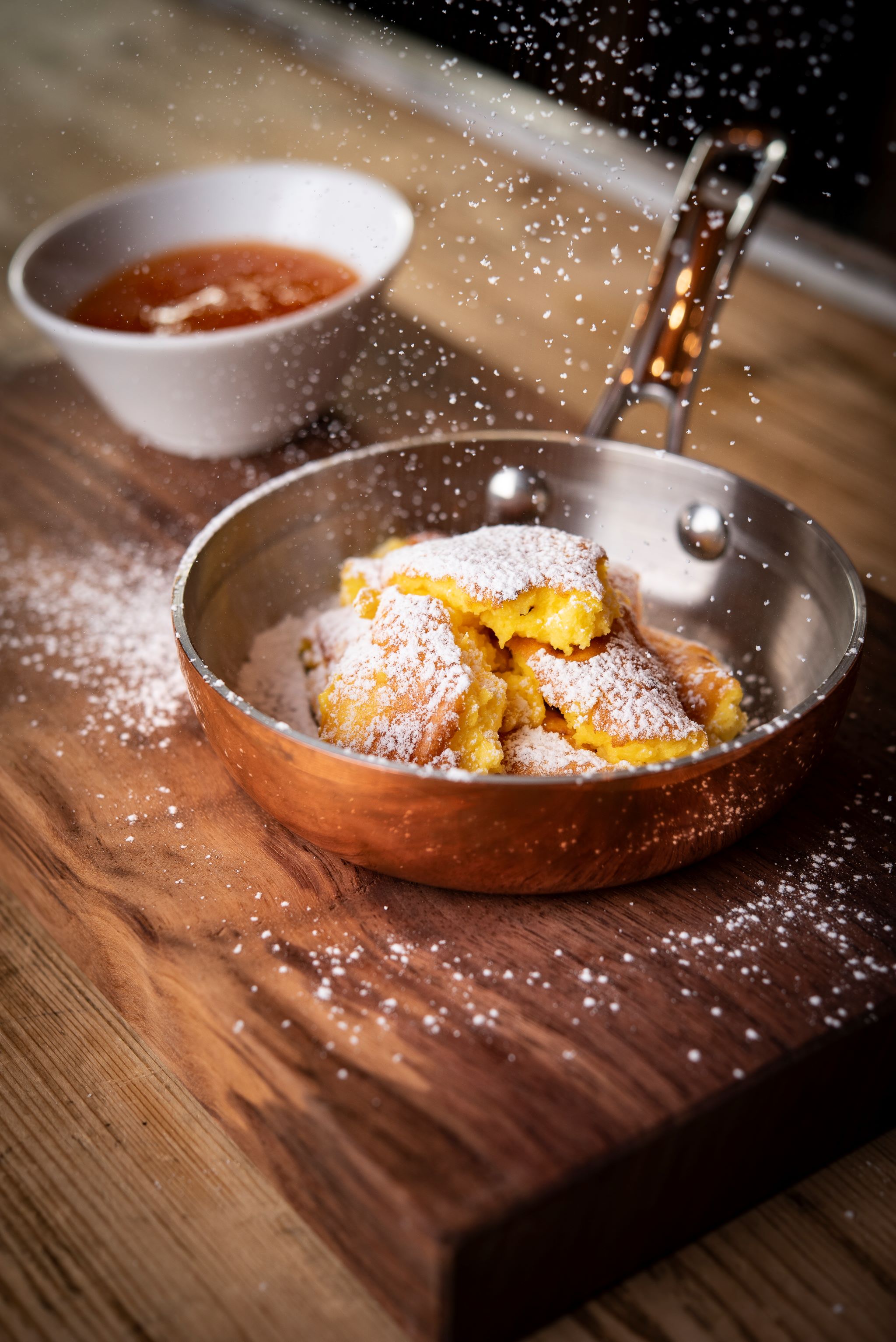 4.Den gebackenen Schmarren mit einem Löffel in kleine Stücke reißen und nach Belieben mit Staubzucker bestreuen.