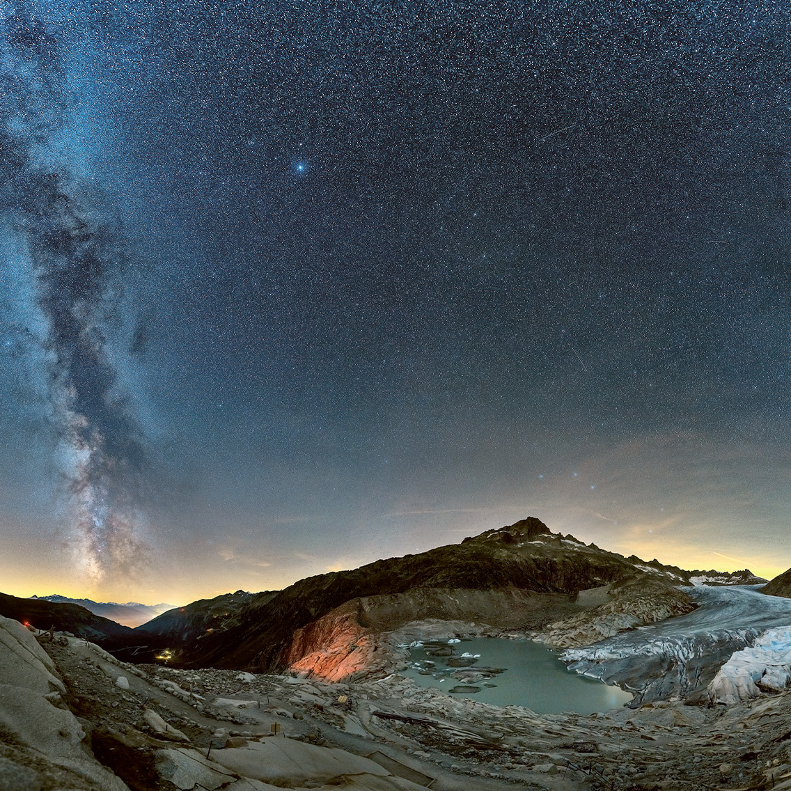 Each of its stars is a sun – some of which even have planets orbiting them. Viewed against the backdrop of the Rhône Glacier, the Milky Way looks all the more majestic. The valley glacier is located in the Uri Alps and is continuously melting, which has resulted in the formation of a small lake.